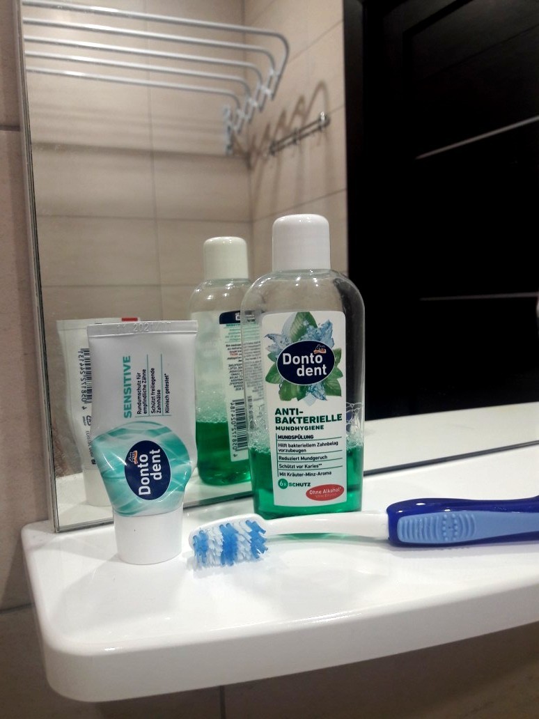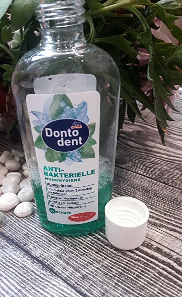3) Ополаскиватель для полости рта Dontodent Antibakterielle Mundhygiene завершает чистку зубов. Ополаскиватель для рта так же имеет в своем составе фторид натрия, поэтому детьми использован не может, более того средство нельзя глотать. Ополаскиватель для рта борется с бактериями в ротовой полости до которых не может дотянуться зубная щетка. Для этого необходимо взять немного средства в рот и прополоскать ротовую полость в течении 30 секунд, после чего средство необходимо выплюнуть.