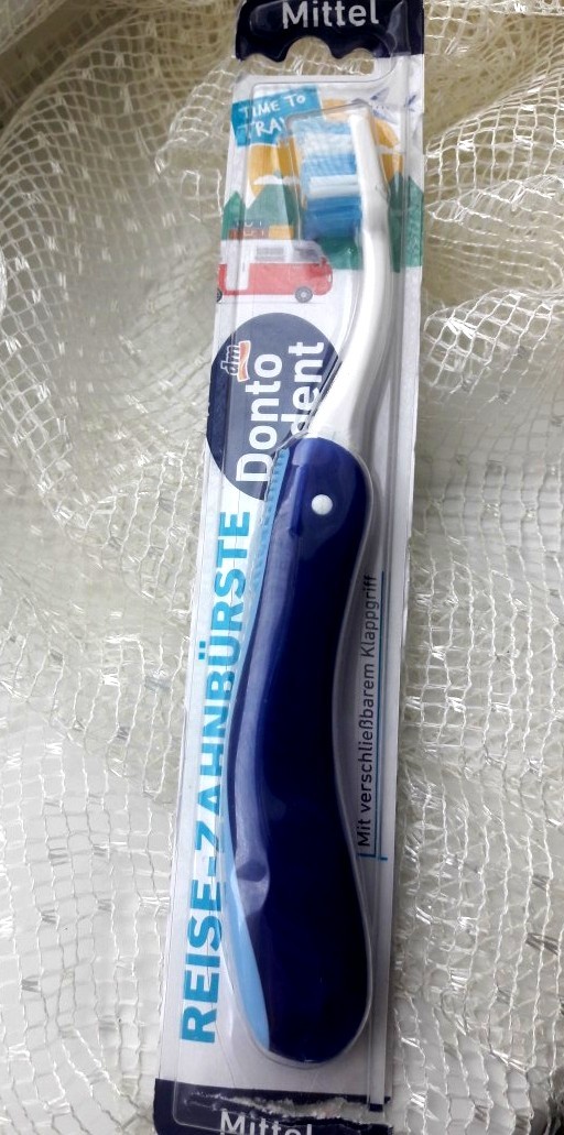 1) Зубной дорожной щетки Dontodent Reise-Zahnbrste. Очень удобная и простая в применении. Умеет складываться до маленьких размеров. В сложенном виде способна поместиться даже в косметичке. Щетина у зубной щетки средней жесткости, но я бы отнесла ее к мягкой.