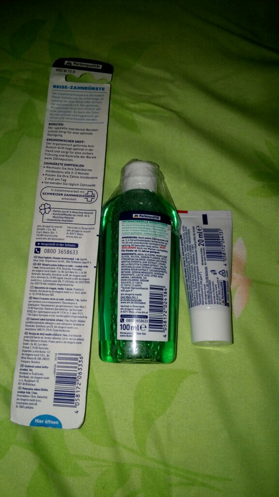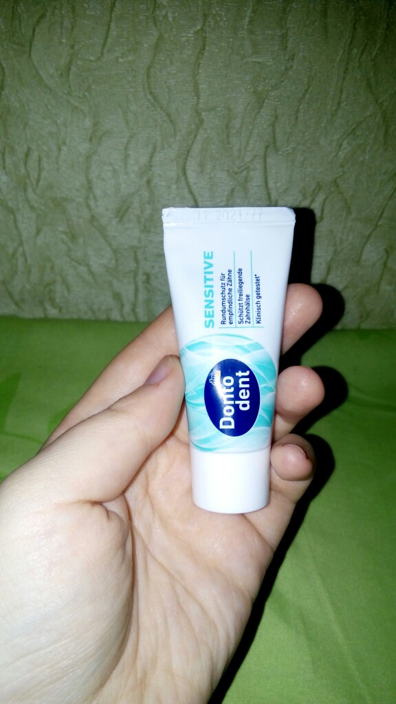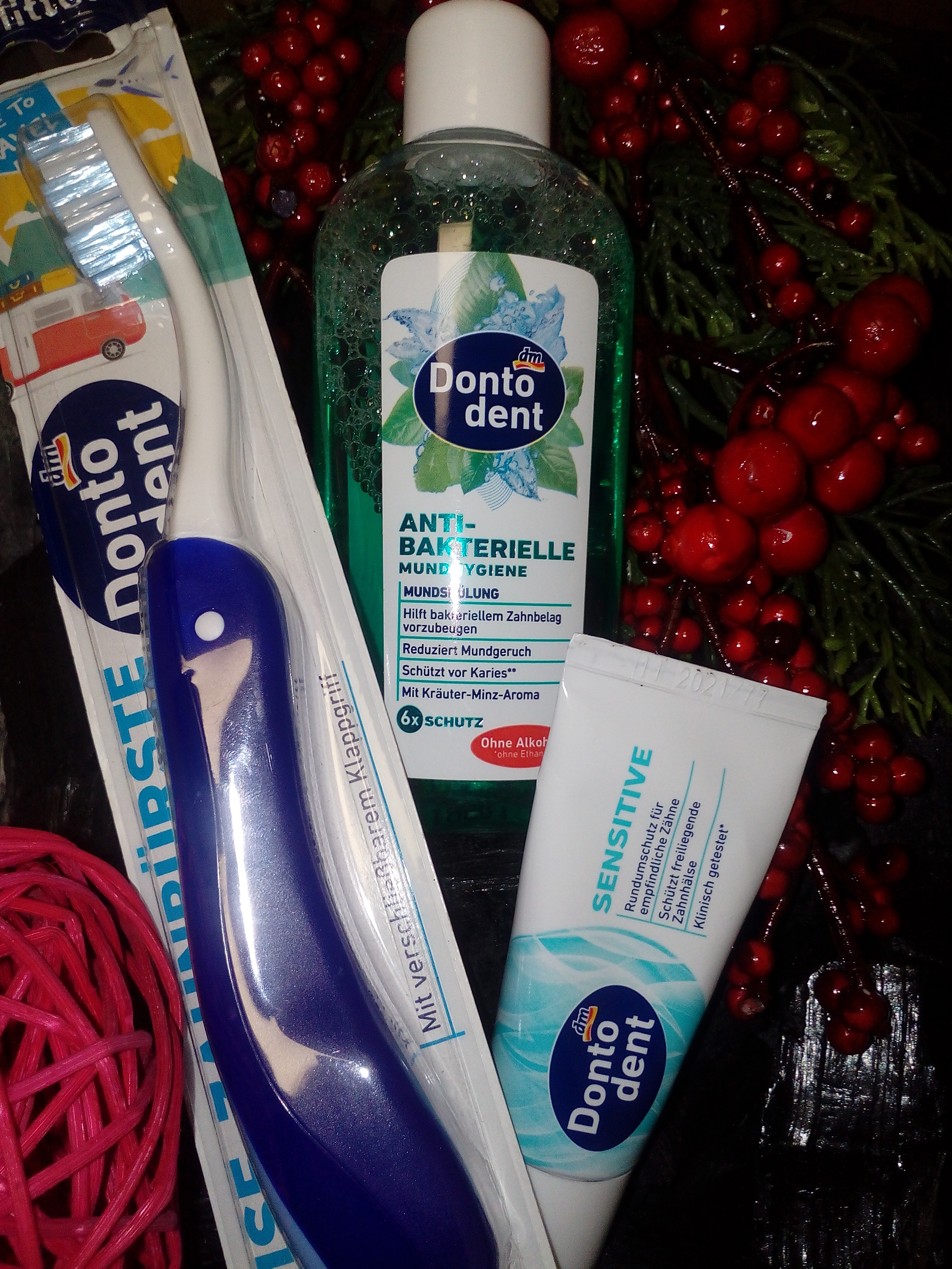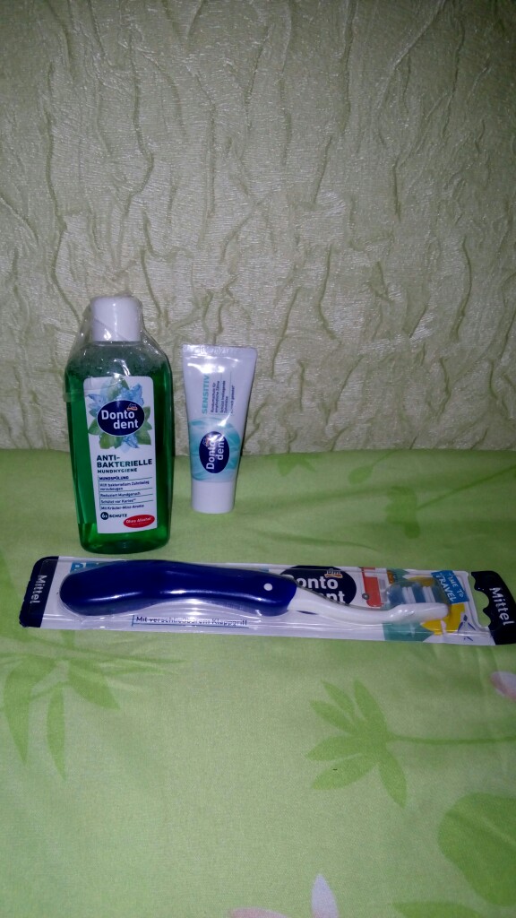 Получила на тестирование набор по уходу за полостью рта Dontodent: пробники зубной пасты и ополаскивателя, а также складную зубную щётку. Хотелось бы отметить: ни на одном товаре не было описания на русском языке. Но понять можно. Даже тем, кто не знает немецкого.